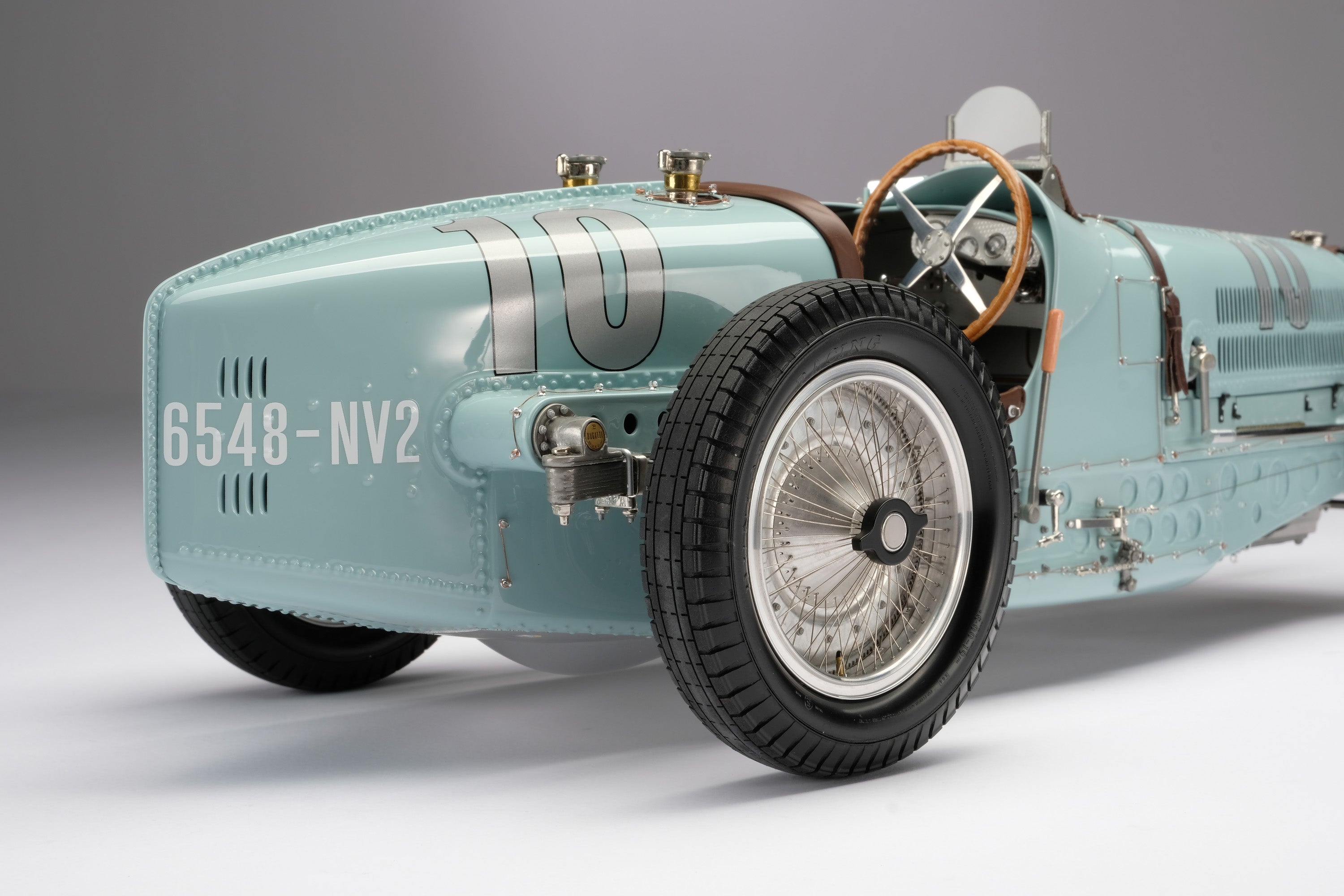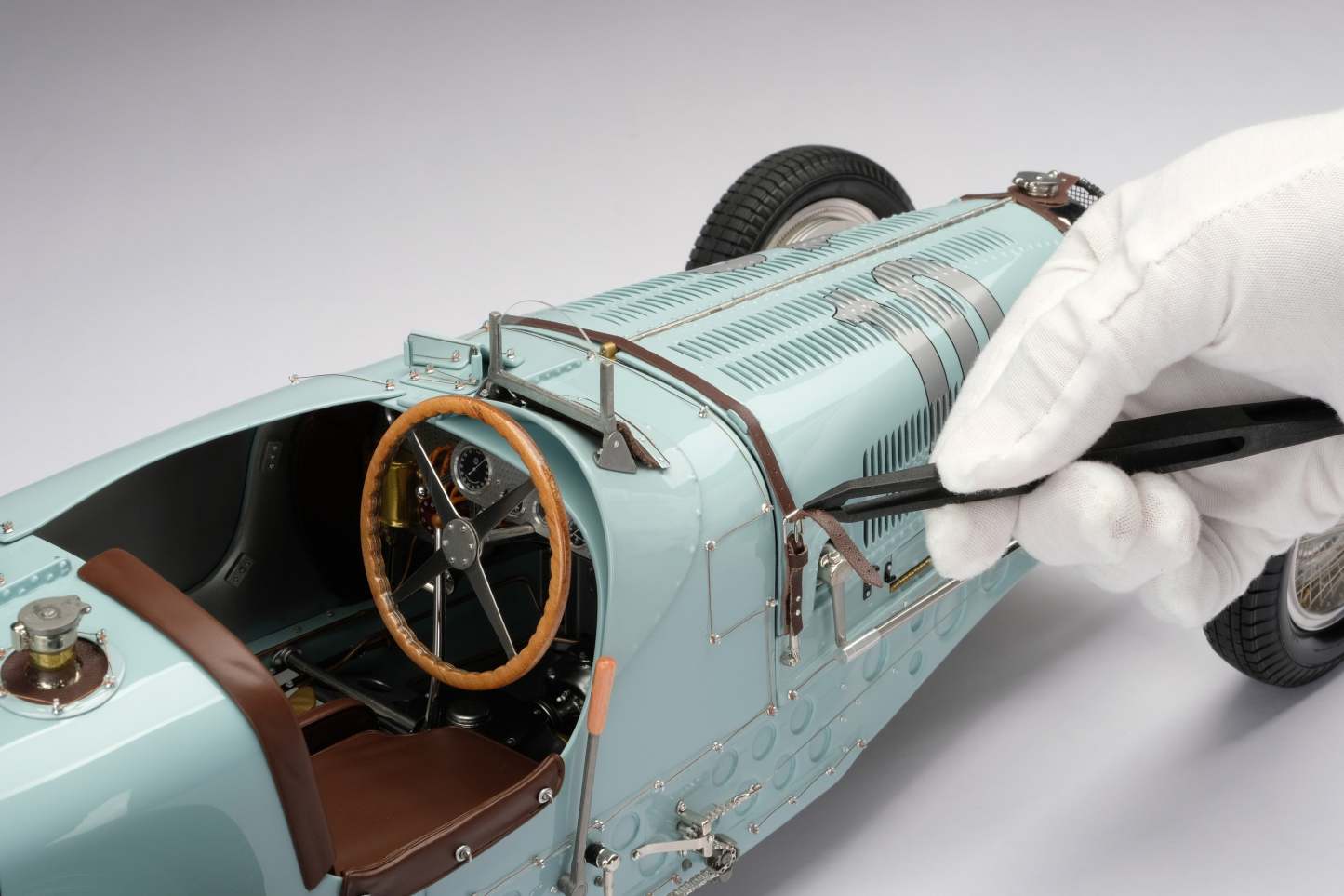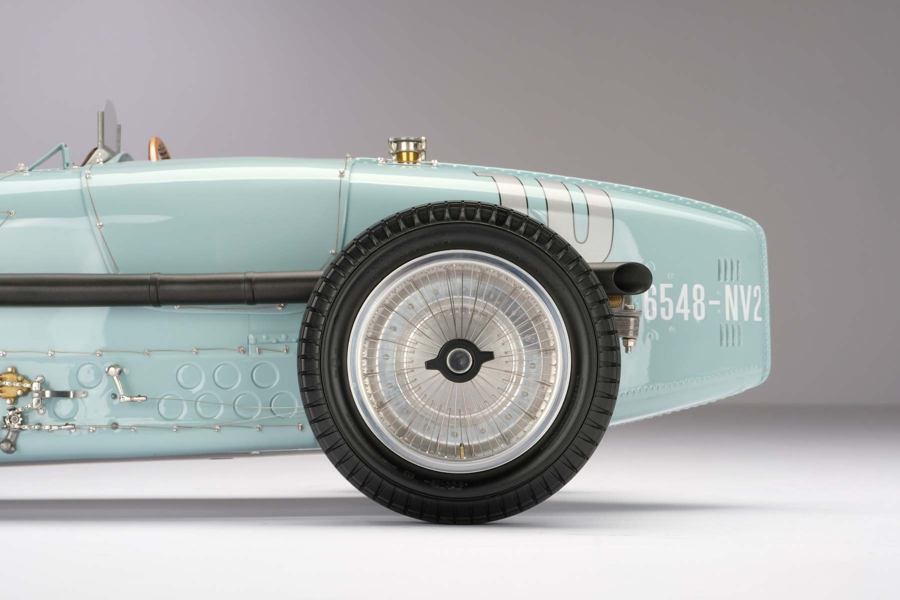 This fine 1:8 scale model is based on the car as raced by Jean-Pierre Wimille in the Belgian Grand Prix on the 14th of July 1935 at Spa-Francorchamps. Wimille qualified fourth and made a fantastic start flying into second position on the opening lap, but the French hope for victory suffered an early retirement after just seven laps due to engine issues. To create the Type 59, we used our supremely accurate digital scanning on chassis 59122, kindly allowed by its current owner Ralph Lauren, and, with the cooperation of Bugatti, developed this stunningly detailed and precise replica at scale.