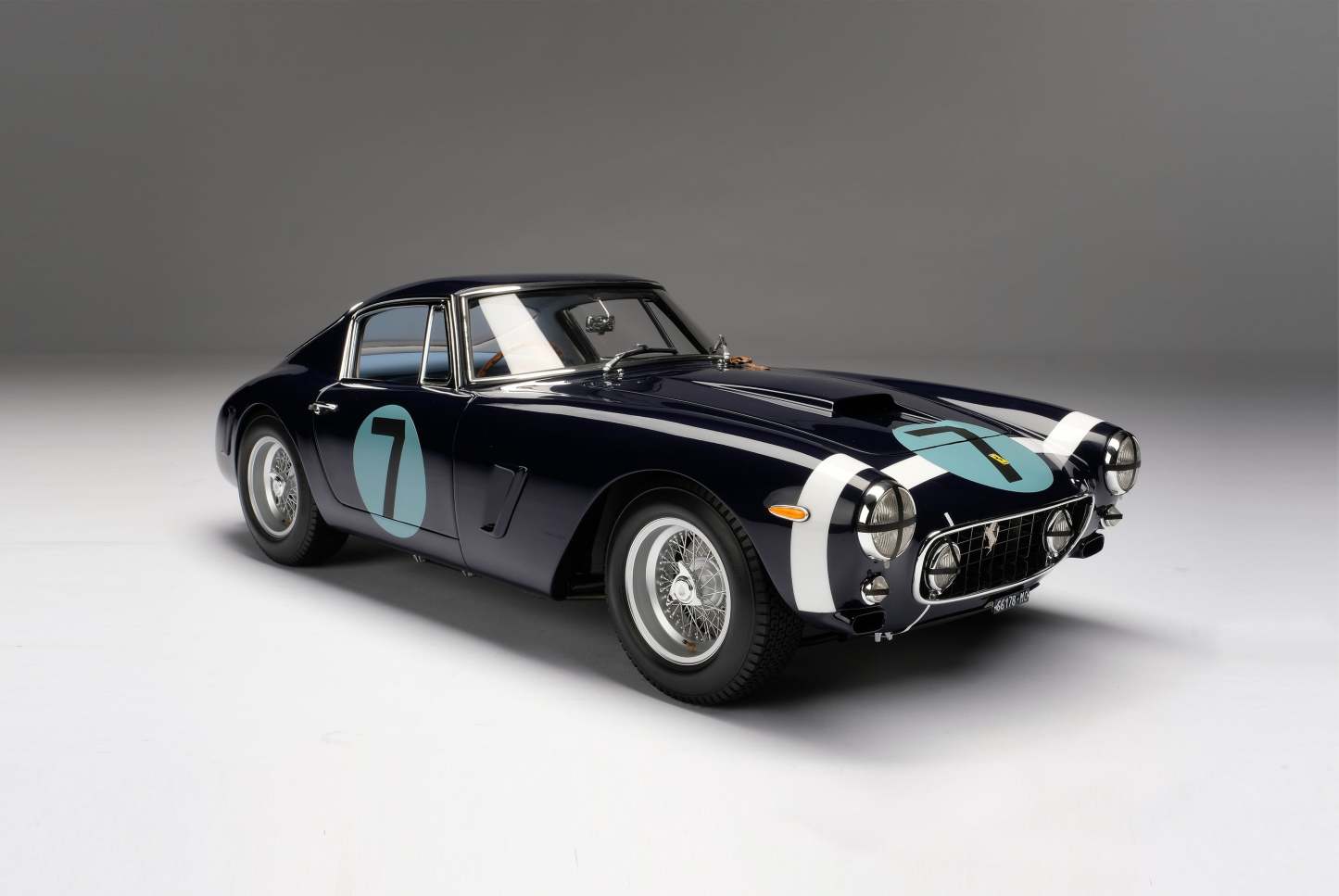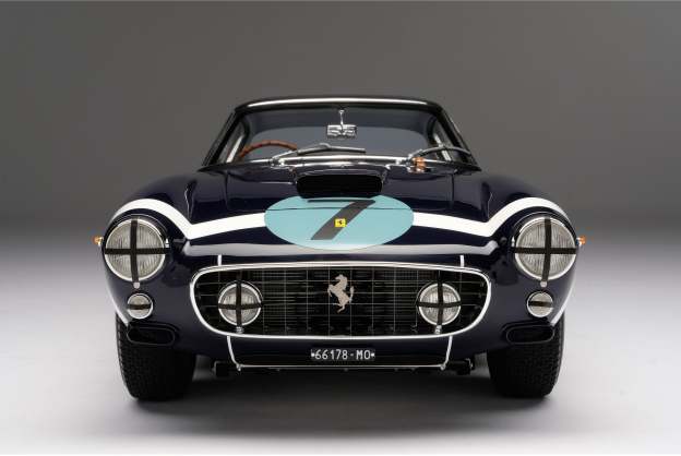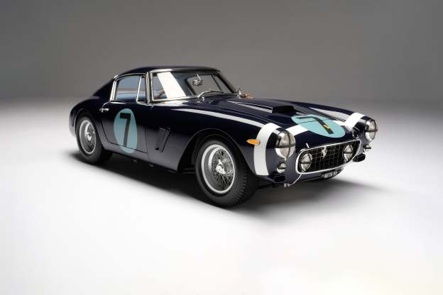 This famous 250 GT was produced in June 1961 and was raced to victory by Stirling Moss in the Goodwood Tourist Trophy in August 1961. The 250 GT short wheel base cars, of which this is one, secured race wins for the Prancing Horse around the globe and took the 1961 Constructors’ Trophy in the GT class. Between 1960 and 1961, the 250 GT SWB was Ferrari’s racing weapon of choice. It was consistently victorious, including success at the Tour de France and the 24 Heures Du Mans. *This particular example is one of only three right-hand drive short wheel base cars and arguably the most famous of all due to its deep blue Rob Walker racing colours and the number 7, denoting its Goodwood TT win in the hands of Moss. Moss described the nimble Ferrari as “the best GT car in the world”. It was also raced in period by Graham Hill and Innes Ireland.