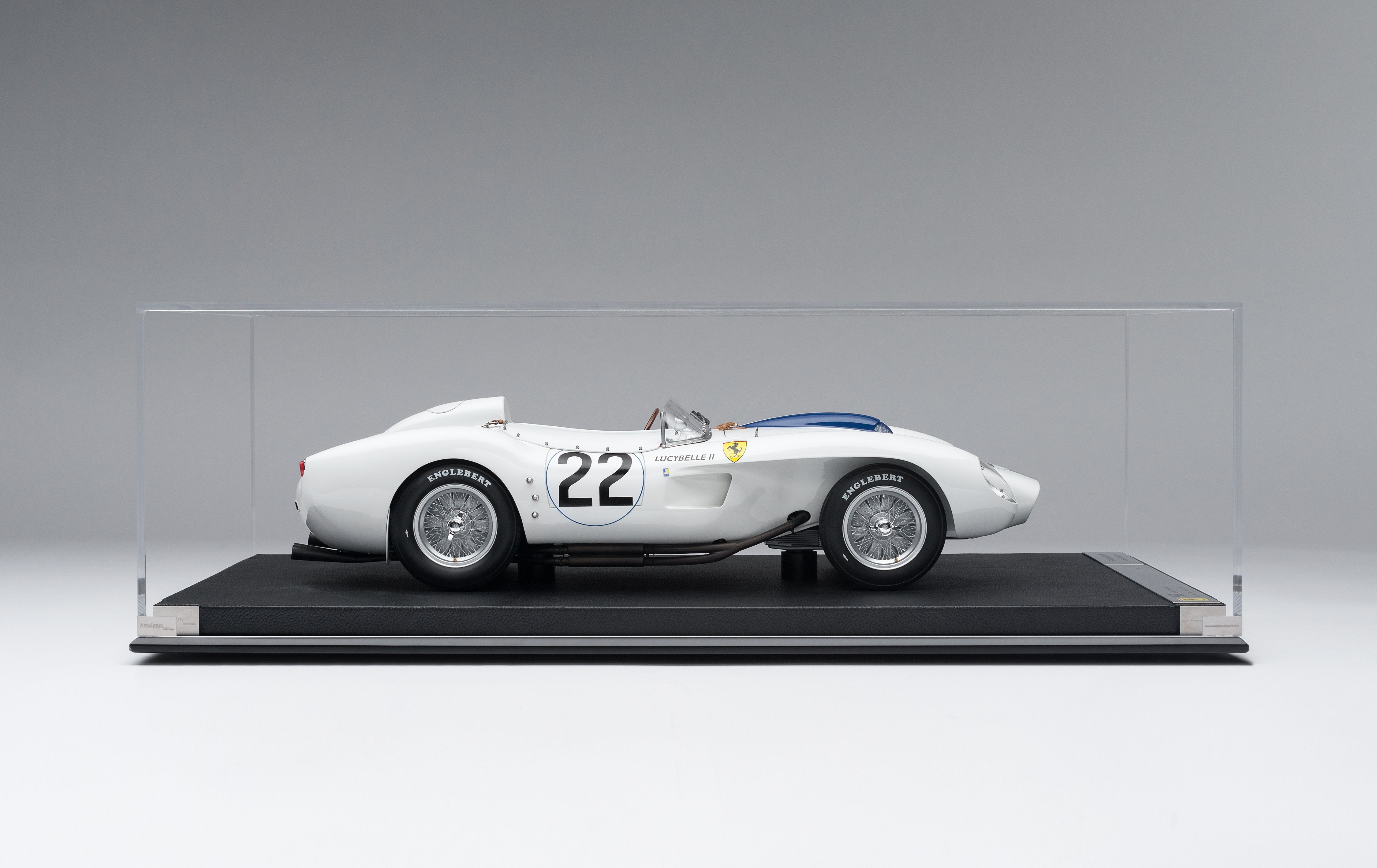 Every Amalgam 1:8 scale model is supplied in a luxury black presentation box and mounted on a carbon fibre or leather base protected by a clear acrylic dust cover. The model title, original branding and edition number are displayed on polished stainless steel plaques mounted at the front end of the base.