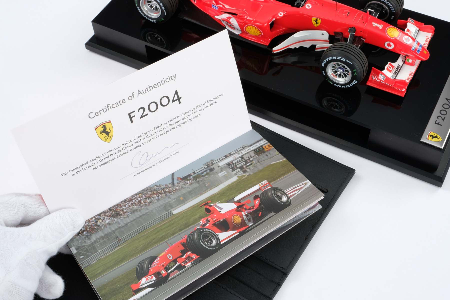 This fine 1:18 scale model of the Ferrari F2004 is precisely as raced to victory by Michael Schumacher in the Formula 1 Grand Prix du Canada 2004 at Circuit Gilles Villeneuve on the 13th of June 2004. The race was chaotic, with only half the field being classified at the finish: six cars retired and another four were disqualified due to brake duct irregularities. Despite this, the Ferraris of Schumacher and Barrichello, starting sixth and seventh respectively, experienced relatively calm races, using a superbly executed two-stop strategy to creep up the order. The duo had to be patient, making initial gains when the Renaults suffered suspension failure and pit stop issues. As the leading cars made their third pit stops, Schumacher sailed past and went on to comfortably claim a seventh win from the last eight races. It was a record-extending 77th career victory and a record-setting seventh triumph in Canada alone, the first time that a driver had won the same Grand Prix on seven separate occasions. Ferrari were already far in the lead in the Constructors’ Championship, having scored twice as many points as their closest rivals.