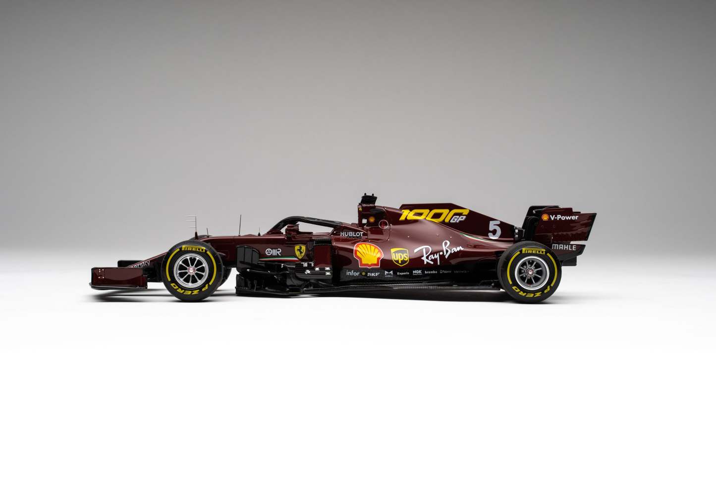 This fine 1:18 scale model depicts the Ferrari SF1000 exactly as raced at the Gran Premio della Toscana Ferrari 1000 at the Prancing Horse’s own Mugello Circuit on the 13th of September 2020. It perfectly replicates the car’s unique, celebratory 1000th Grand Prix livery. The burgundy colour was tribute to Ferrari’s origins and harks back to the colour of the 125 S, the first racing car to carry the Ferrari name. The look of the race numbers reflected the tradition of the past, giving the impression of being hand painted onto the bodywork, while the drivers’ race suits matched the car colour. It has been handcrafted and finished in our workshops with the co-operation and assistance of Scuderia Ferrari regarding original CAD data and detailed colour and material specifications. Furthermore, it has undergone detailed scrutiny by both engineering and design teams to ensure complete accuracy of representation.