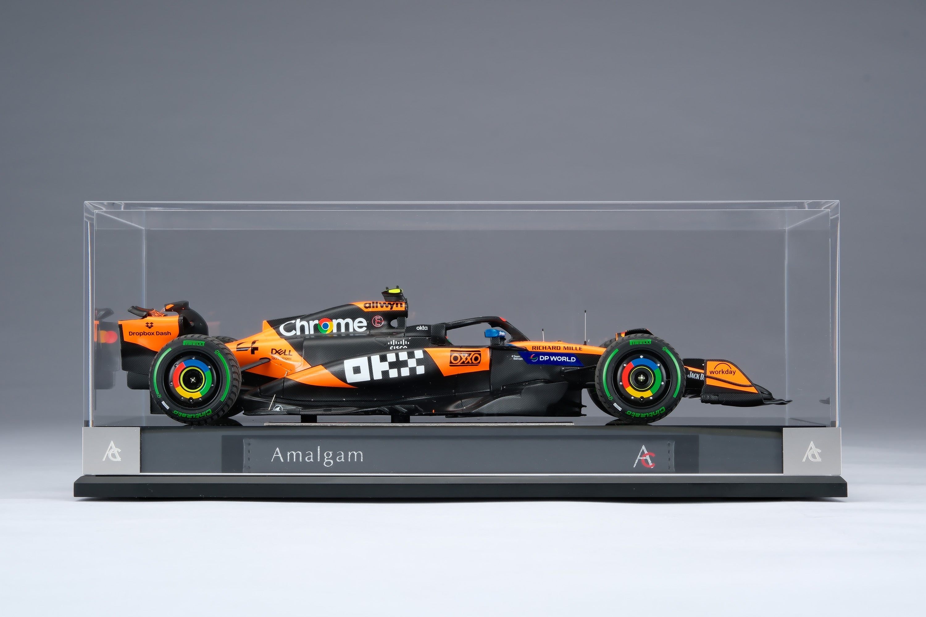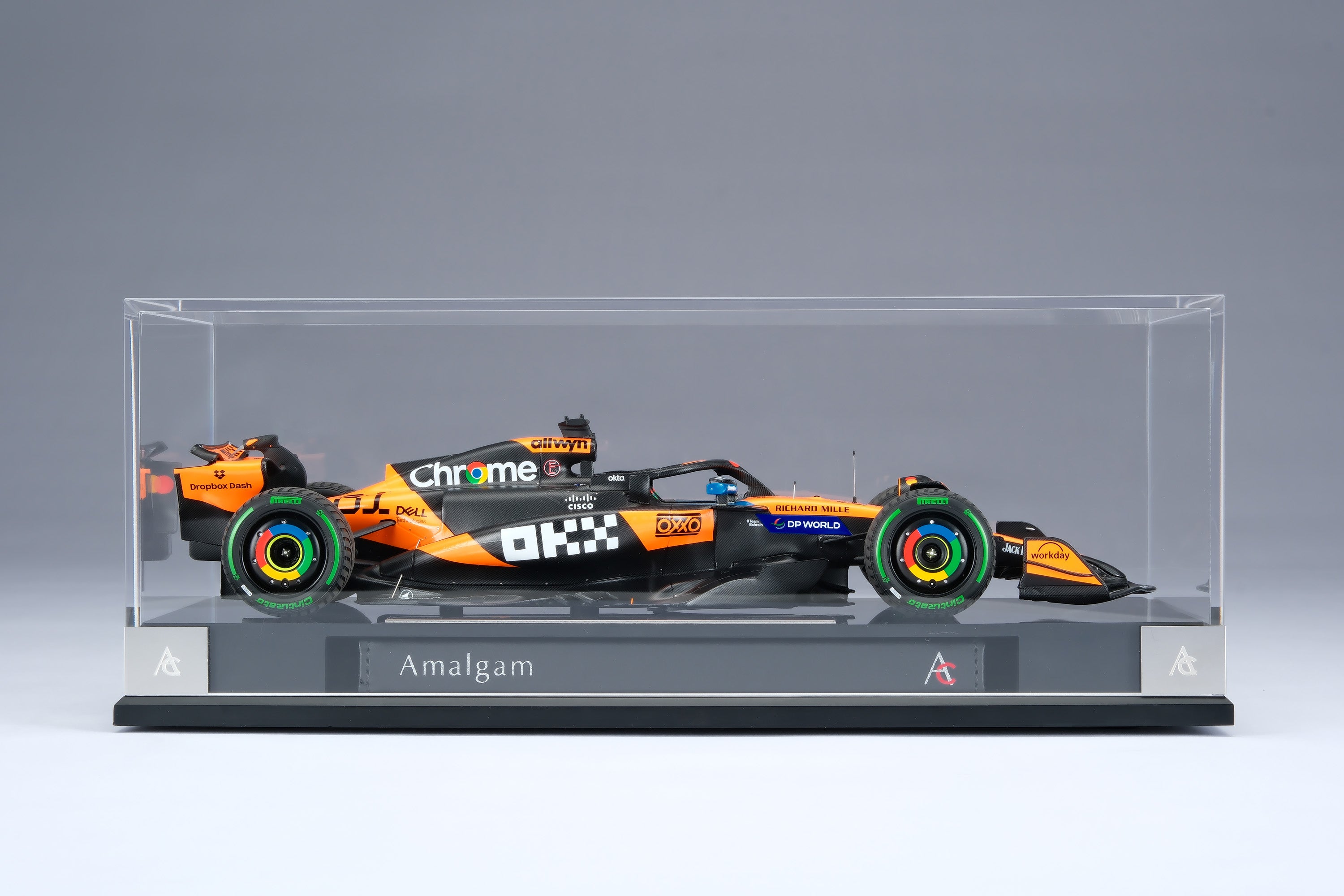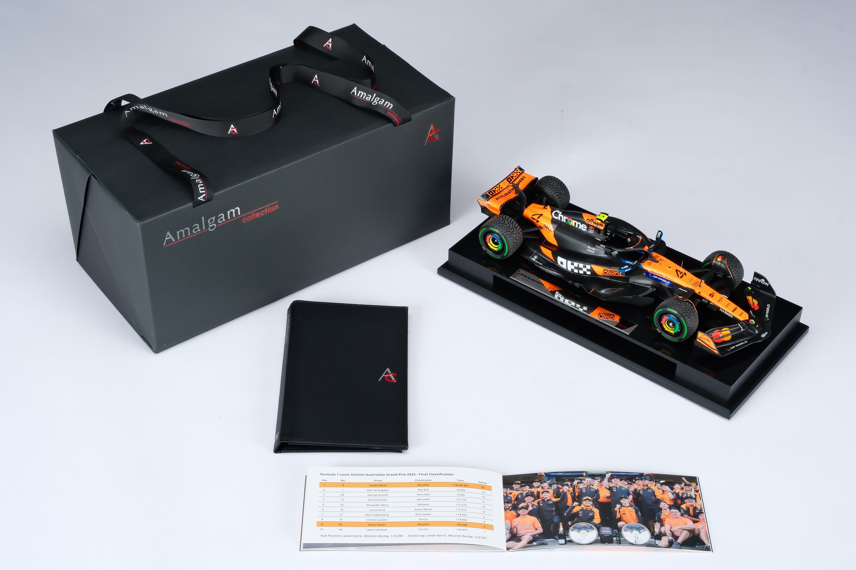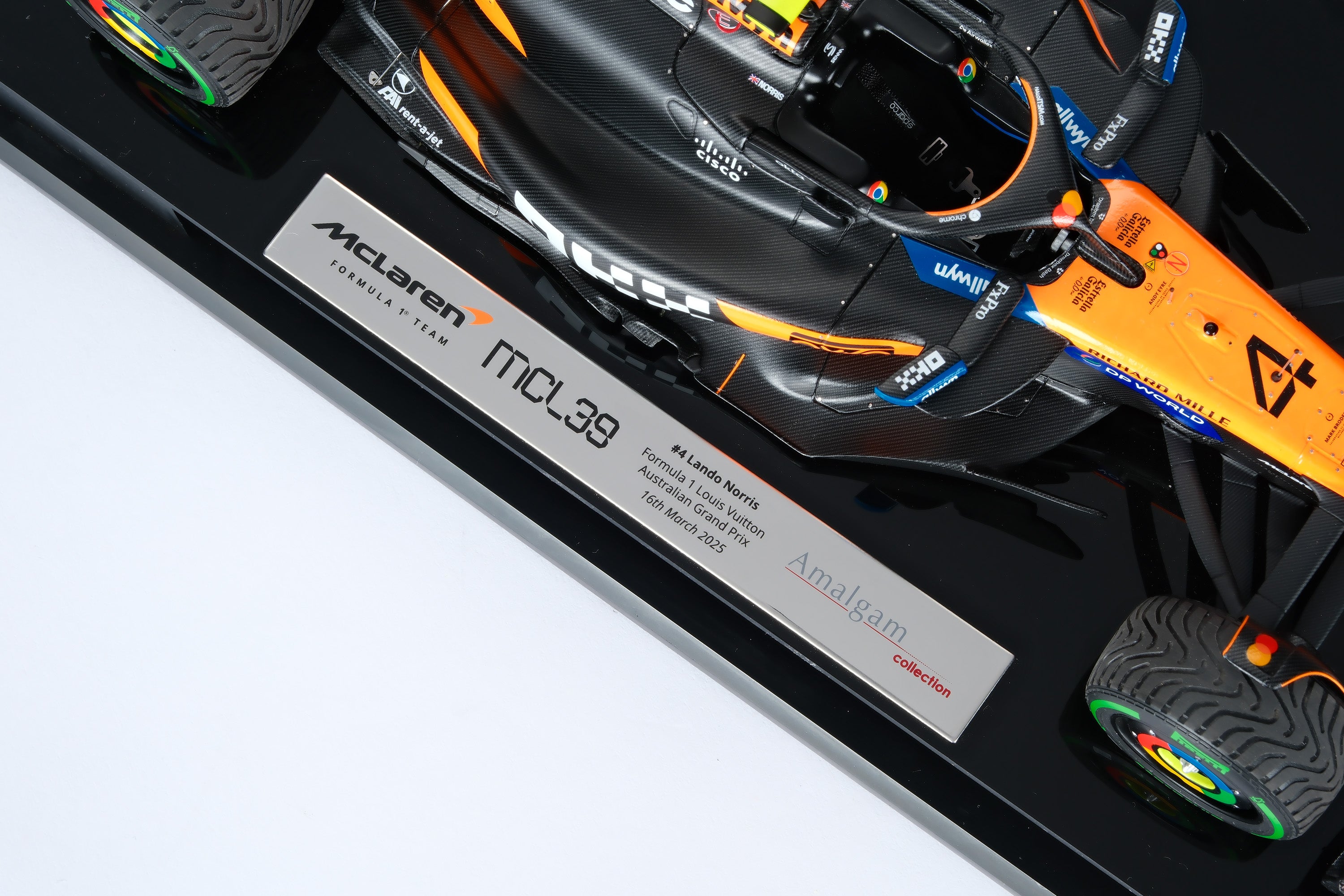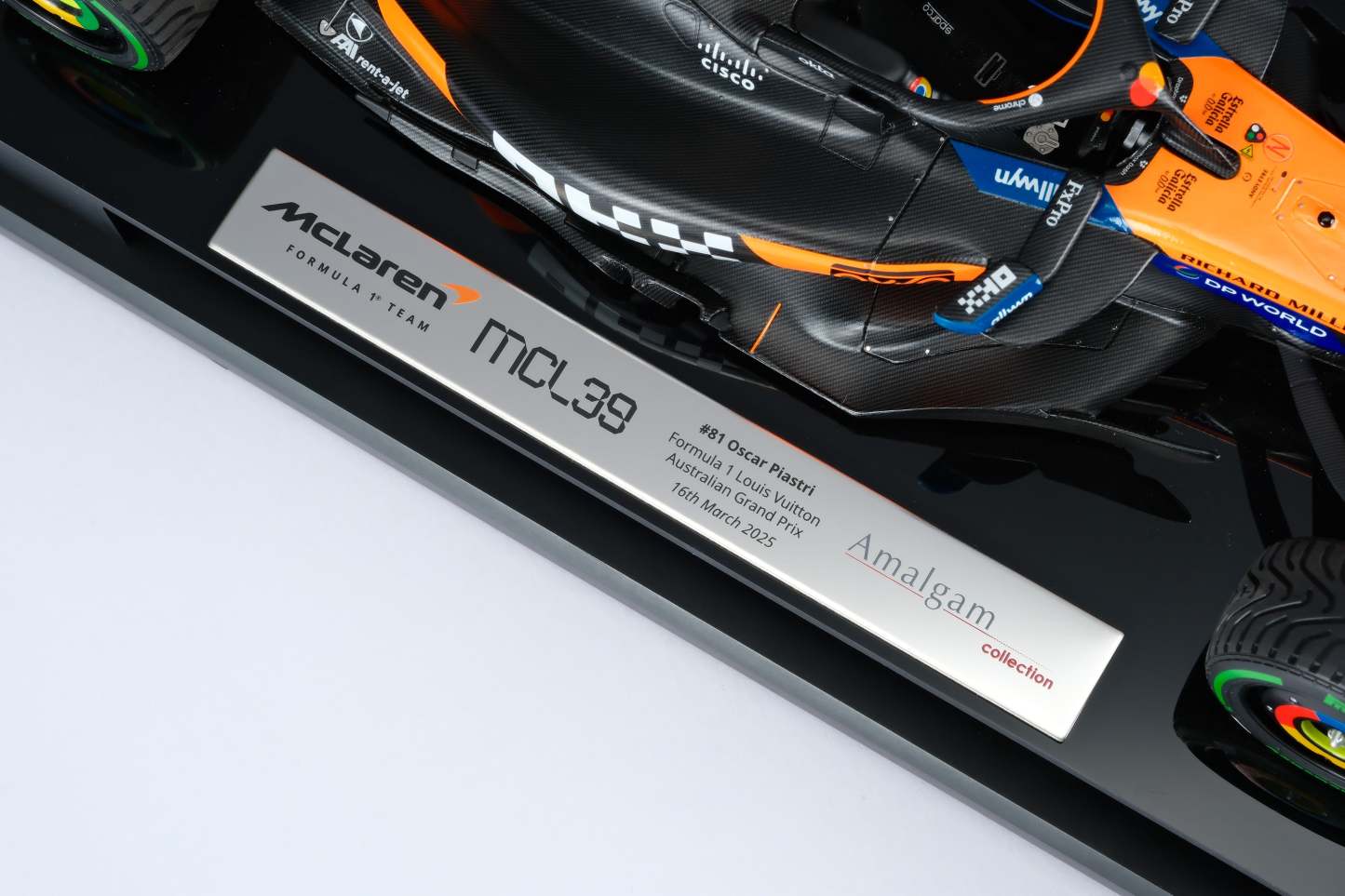 These fine 1:18 scale models of the McLaren MCL39 replicate the cars raced to first and ninth by Lando Norris and Oscar Piastri in the Louis Vuitton Australian Grand Prix at Albert Park Circuit on the 16th of March 2025. The McLaren duo qualified first and second, with Norris narrowly pipping Piastri to pole by 0.084 seconds after comfortably taking the provisional top spot from Red Bull’s Max Verstappen by three-tenths of a second. After an aborted start caused by Isack Hadjar spinning his Racing Bull into the barrier on the formation lap, polesitter Norris got away well to maintain the lead into Turn 1, fending off challenges from Piastri and Verstappen, though Verstappen passed the home favourite en route to Turn 2. Almost immediately, another Safety Car was called when Jack Doohan crashed his Alpine. At the race restart, Norris pulled away from Verstappen, who in turn opened a gap to Piastri, allowing the leaders to break from the chasing pack. Verstappen ran wide at Turn 10 going too deep into Turn 11, giving Piastri the chance to reclaim second. Within just two laps, Piastri had established a five-second advantage over third place. By Lap 25, Norris’ lead over Piastri stood at just under two seconds, while Verstappen was already around ten seconds back. After navigating backmarker traffic, the McLarens were free to race, though Piastri soon ran wide at Turn 6 and dropped three seconds. Further drama unfolded on lap 34 when Fernando Alonso crashed heavily, prompting another Safety Car and a flurry of pit stops. At the end of Lap 41, Norris managed the restart perfectly to retain his lead over Piastri and Verstappen.