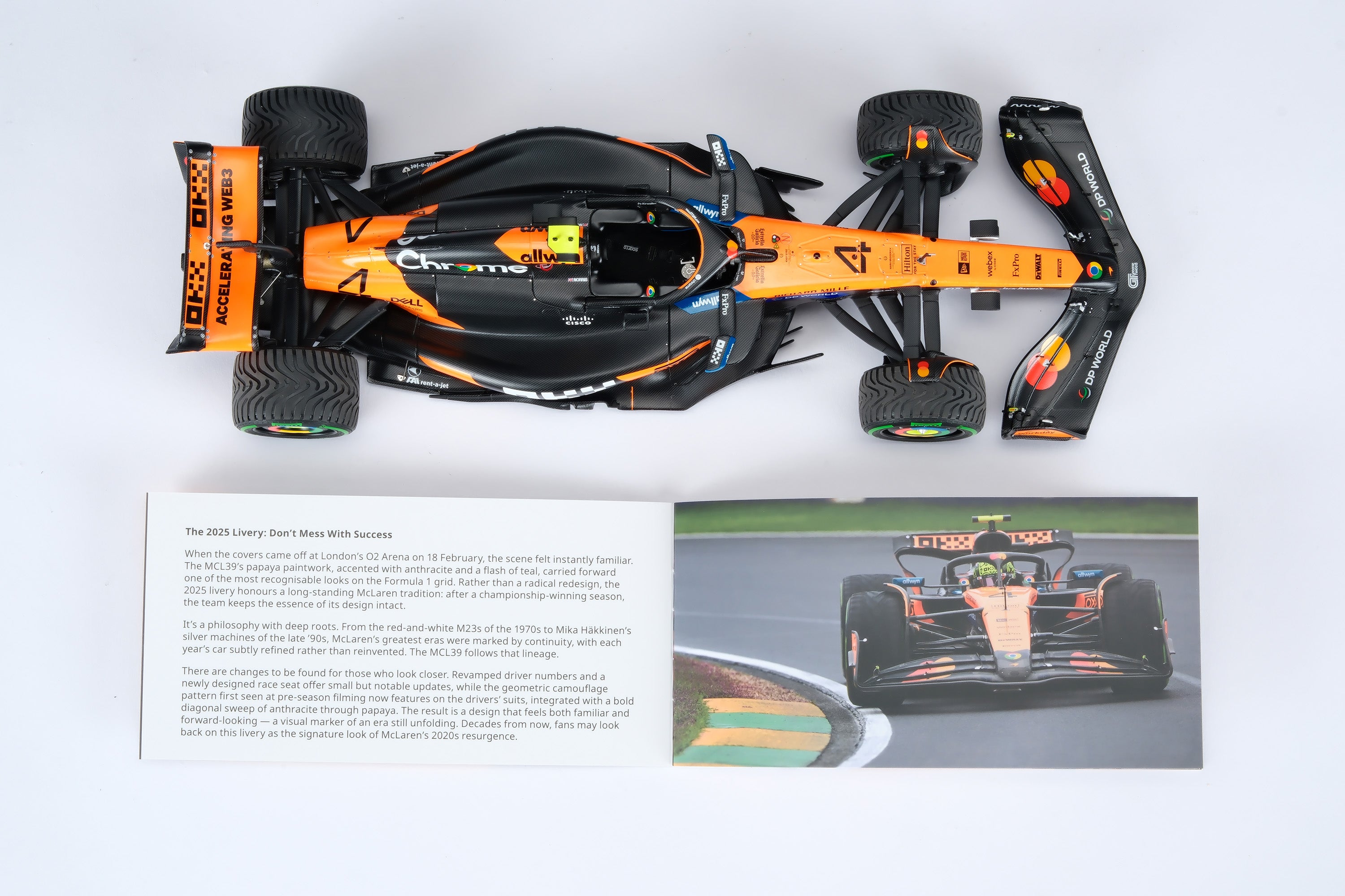 The first McLaren to win both the World Drivers' Championship and World Constructors' Championship in the same season since the Adrian Newey-designed MP4/13 of 1998, the MCL39 sought to build on the successful foundation of the previous year’s Constructors’ Championship winning MCL38. In the hands of Lando Norris and Oscar Piastri, in their seventh and third seasons with the team respectively, the MCL39 secured the Constructors’ title in joint-record time at the Singapore Grand Prix, with six races remaining in the season. Lando Norris secured his maiden Drivers' Championship at the final race of the season, becoming the first McLaren driver since 2008 to earn the honour.