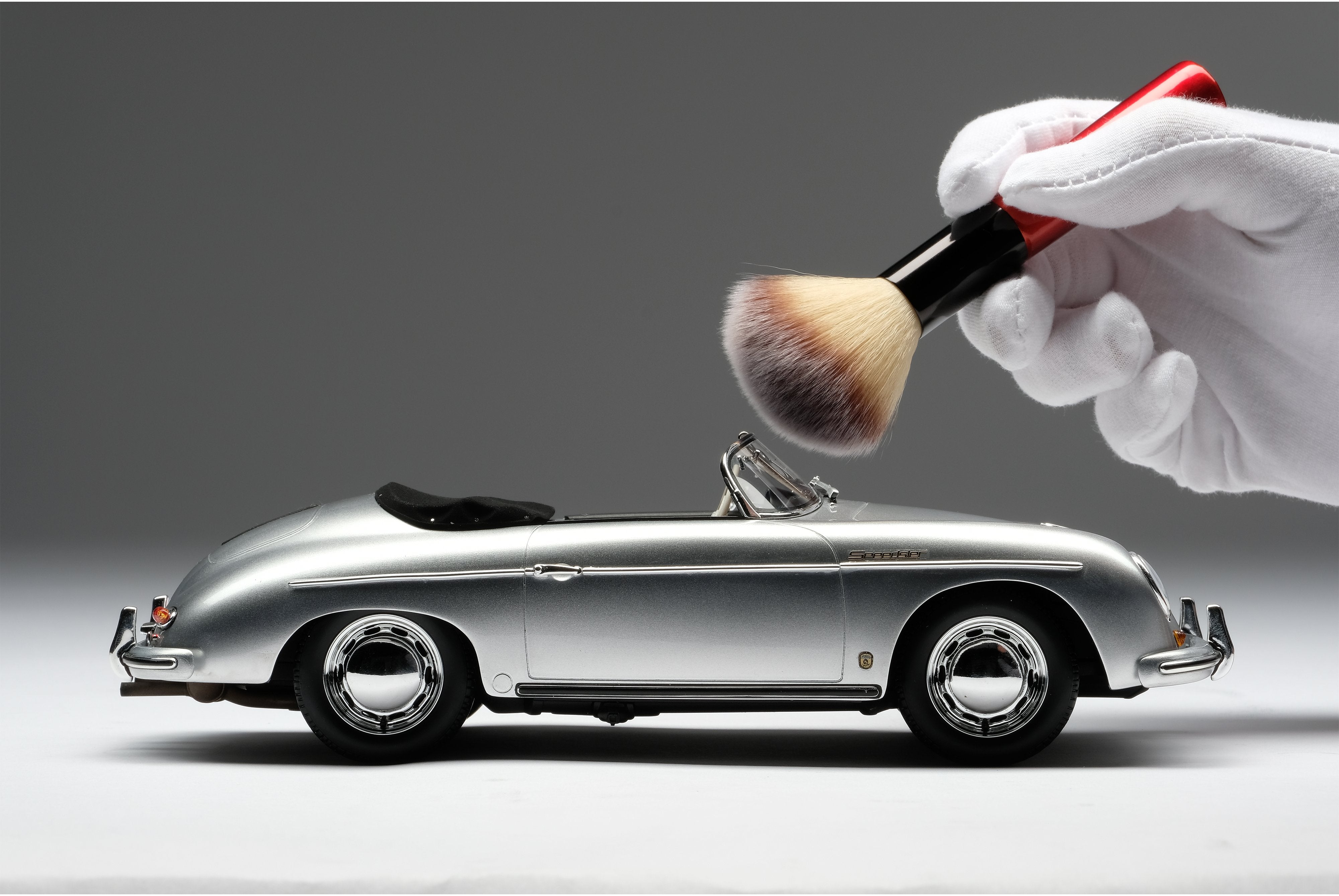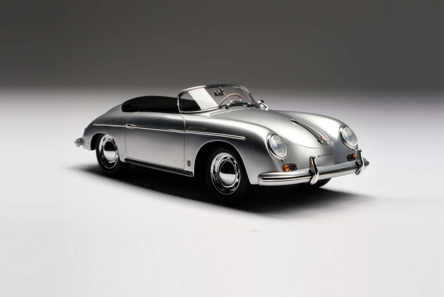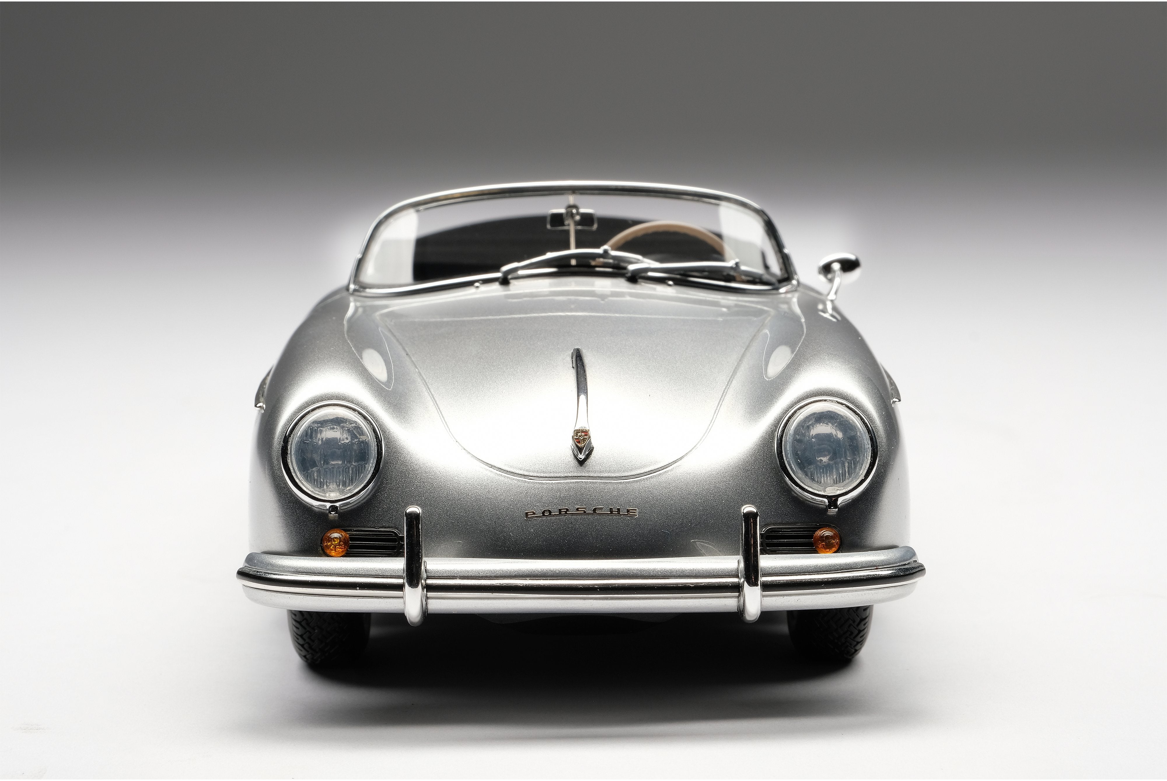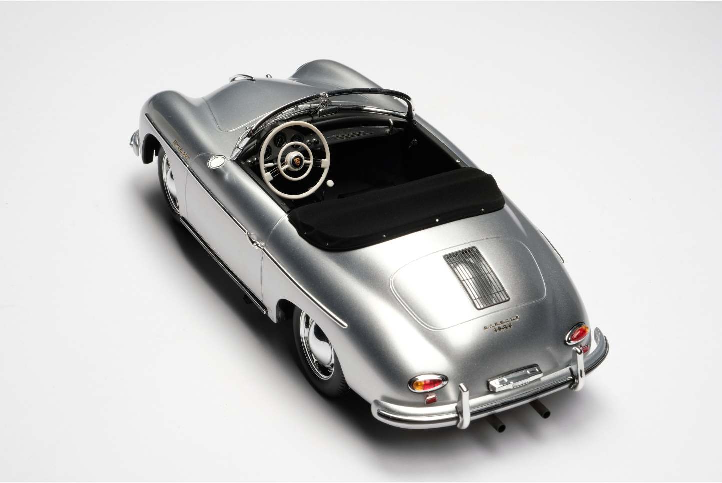 This fine 1:18 scale model is of the Type 2 (or ‘T2’) variant, revised in 1957 to incorporate its exhausts through the rear bumper over-riders. The Speedster version offered some significant differences to it coupé and cabriolet siblings, with a low removable windscreen for weekend racing, fixed bucket seats and side curtains instead of wind-up windows. The ‘T2’ also benefitted from a number of improvements to the gearbox, clutch and steering which made them easier and more pleasant to drive.